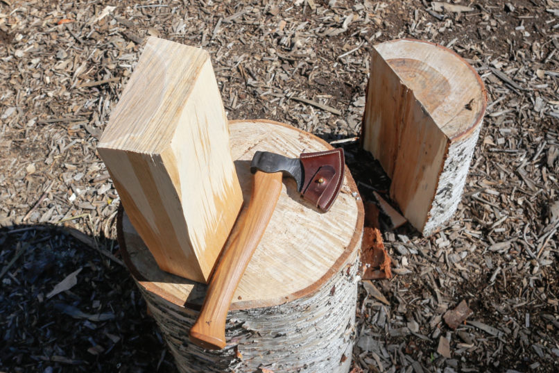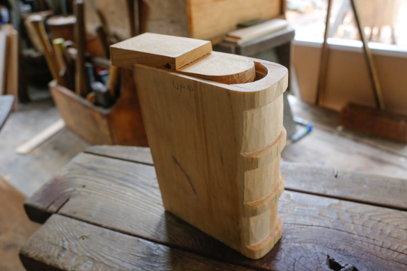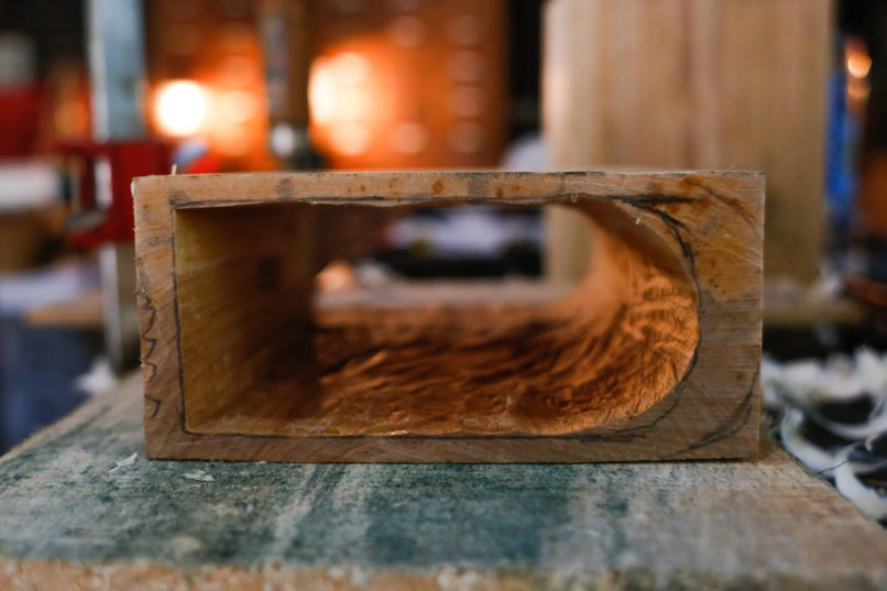 The process starts out by splitting a freshly sawn log and roughing out the shape of the box with an axe and froe. From there, the center of the box was hogged out using a T-handle auger, being careful to drill the holes straight and not make the walls of the box too thin.