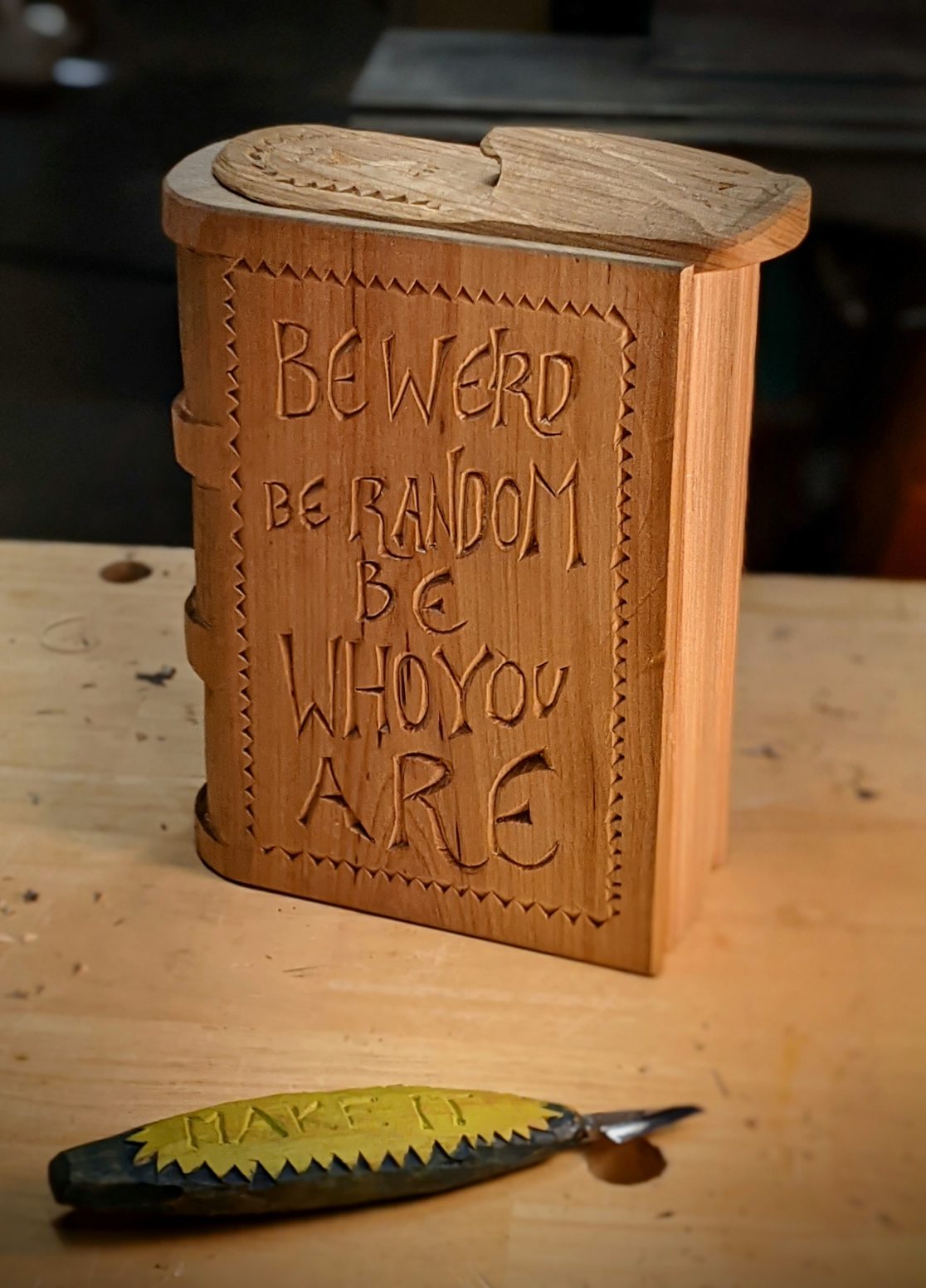 Next, using gouge, knife, and chisel the shape of the box is refined. A grove is carved in the bottom of the box using a knife, where a kiln-dried bottom is fitted to the base. As the piece dries the two pieces of wood lock together. Because this was a week long course we used an oven to speed up this process. A few of the boxes got a little more toasted than others depending on where in the over they were positioned. The last part was to carve a sliding tapered dovetail for the lid to slot into and then finally it was time for the decorative carving and painting.